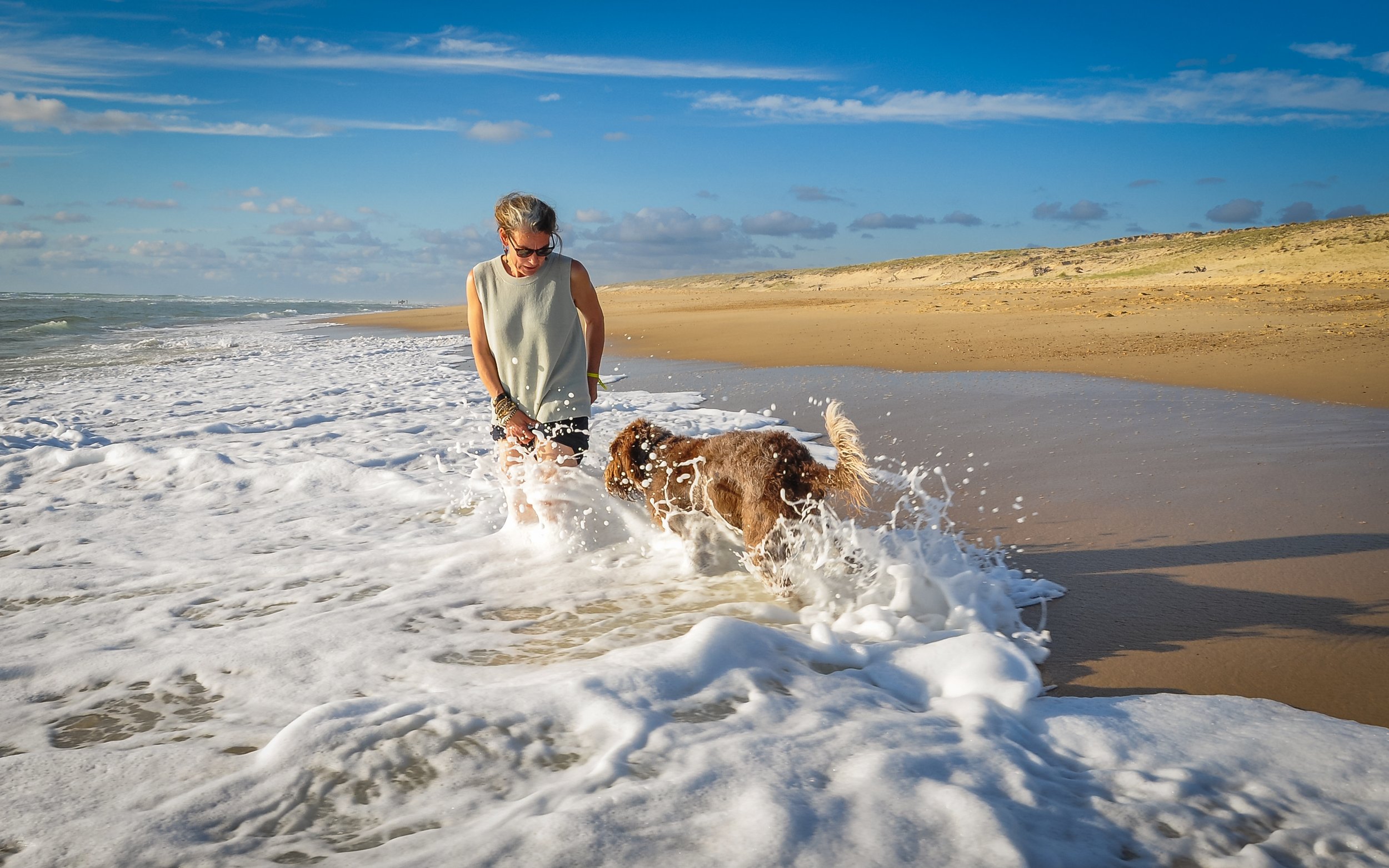 Sie kann sich wunderbar selbst beschäftigen und denkt sich gerne etwas aus. In der Bretagne zum Beispiel hat sie Algen durch die Luft geworfen und wieder aufgefangen – völlig in ihrer eigenen kleinen, kreativen Welt. Ihr Gehorsam ist sehr gut, aber sie möchte Dinge, die sie gerade begonnen hat, zuerst zu Ende bringen. Und das zeigt sie mir eindeutig: ein kurzer Blick, der sagt „Gib mir 10 Sekunden und dann komm ich".